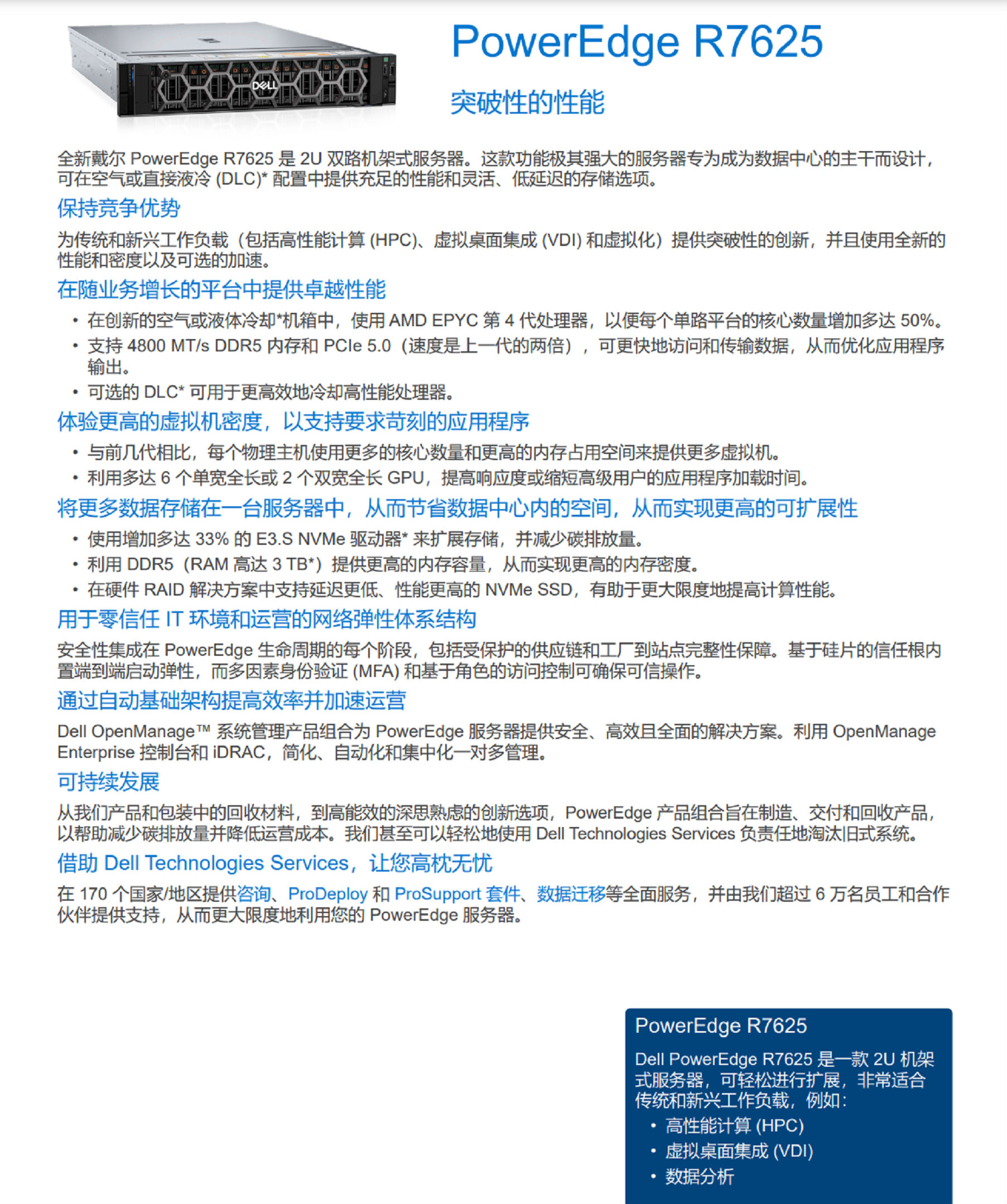 全新戴爾 PowerEdge R7625 是 2U 雙路機架式服務(wù)器。這款功能極其強大的服務(wù)器專為成為數(shù)據(jù)中心的主干而設(shè)計,可在空氣或直接液冷 (DLC)* 配置中提供充足的性能和靈活、低延遲的存儲選項。