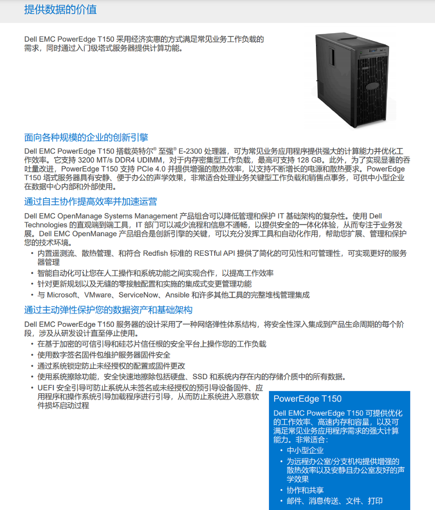 PowerEdge T150 采用英特爾? 至強(qiáng)? E-2300 處理器,是一款入門級(jí)塔式服務(wù)器,在適應(yīng)性與經(jīng)濟(jì)實(shí)惠性之間實(shí)現(xiàn)了出色平衡,可滿足不斷變化的計(jì)算需求。