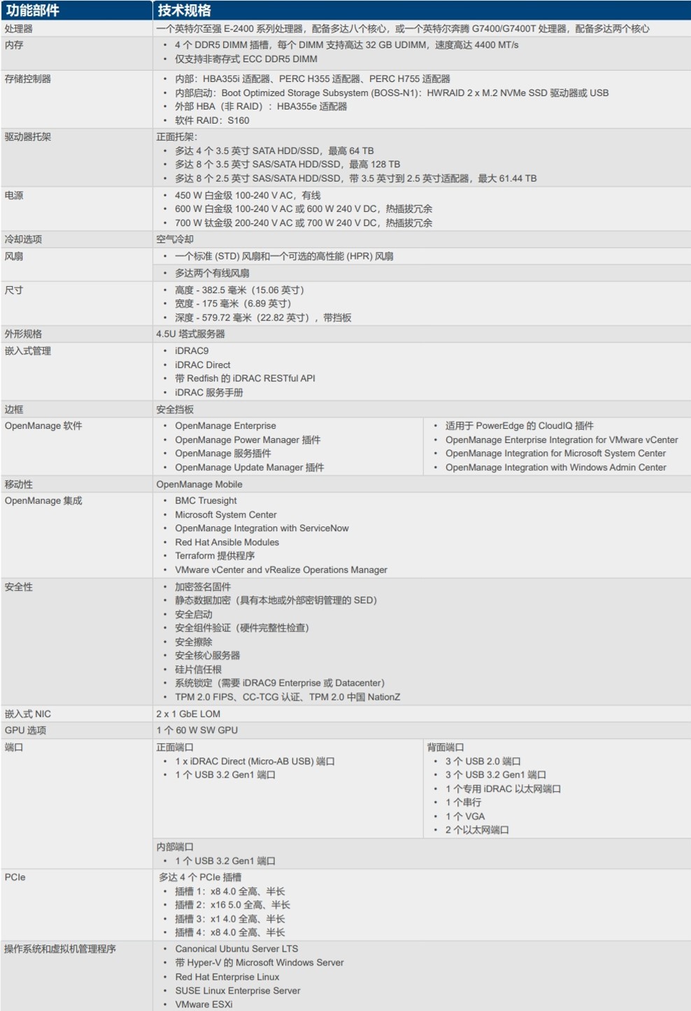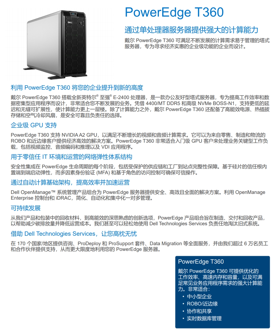 4.5U 單路 PowerEdge T360 的外形規(guī)格經(jīng)過專門設(shè)計,非常適合需要多功能性、經(jīng)濟性和處理能力的客戶。