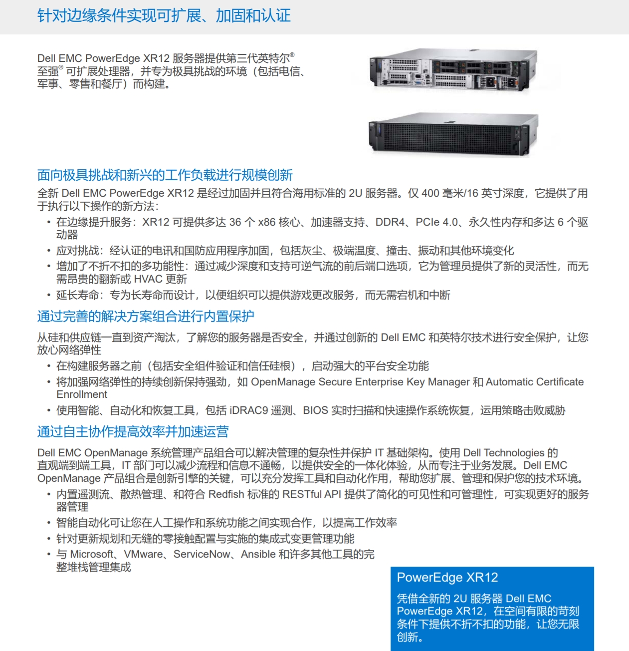 Dell EMC PowerEdge XR12 服務(wù)器提供第三代英特爾?至強? 可擴展處理器,并專為極具挑戰(zhàn)的環(huán)境(包括電信、軍事、零售和餐廳)而構(gòu)建。